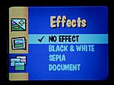 The LCD always displays your images in color unless you are snapping images with one of the special effects turned on. (Black & white or sepia-tone.) In addition, you'll see helpful icons appear in the LCD if you have adjusted the cameras exposure, locked the exposure, selected a border to appear over your image, or turned on the date stamp. Pressing the Menu button in Capture mode brings up a menu for setting the most commonly-used picture-taking controls.