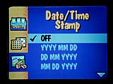 Exposure is automatically controlled on the DC5000, but you do have a few options to play with. The built-in flash operates in Automatic, Off, Fill and Red-Eye Reduction modes, all selected via the flash button. Exposure compensation (EV) can be adjusted from -2.0 to +2.0 through the capture menu. White balance can be set to Automatic, Daylight, Fluorescent or Tungsten, to match existing light sources. For metering, you can choose between Multi-Pattern, which averages the light values of the entire image, or Center-Weighted, which simply meters from the very center of the subject (good for high contrast or backlit subjects). The ISO menu selection optionally enables the Auto ISO Sensitivity function, which automatically increases the shutter speed when the flash is turned off (intended for low-lit indoor shooting scenarios). You can adjust the image sharpness and there's a fun selection of image borders and effects to dress up your images. There's even a Document mode that increases the contrast and image brightness so that captured text stands out. Finally, a 10 second self-timer gives you an opportunity to jump into the picture before the shutter is fired.