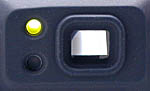 The picture below shows the front of the camera. From right to left, key features are the onboard flash, viewfinder, light sensor (flash and autofocus), lens, and indicator light for the self-timer. The DC280's lens retracted into the camera body when it was shut off, but the DC5000's is protected with a rigidly-mounted tubular metal housing, capped with a glass protective cover. The lens still extends and retracts when the camera is turned on or off, but does so within the safety of this protective assembly. A set of 37mm filter threads are available at the end of the housing assembly, allowing filters and auxiliary lenses to be attached.