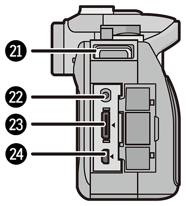 The G3's right-hand panel--previously featureless in the earlier G2 model--now includes a small rubber compartment door imprinted with an HDMI logo. Behind this can be found not only the high-definition video output connector, but also a terminal for the cabled remote control, and a shared port for standard-definition video output and USB 2.0 High Speed data connectivity. The small cutout at the bottom of the G2's right panel which provided access to the battery compartment for the optional AC adapter's dummy battery cable has been moved to the bottom of the camera, instead. The left-hand end of the G3, which isn't pictured here, is essentially featureless; in the G2 it was home to two separate compartment covers for all the same connections now hosted on the G3's right-hand side. Unlike the G2, though, the G3's remote connector doesn't serve double-duty as an external mic connector; there's no support for external microphones in this camera.
