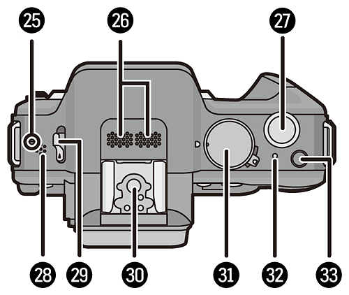 Seen from below, the only change between the Panasonic G3 and its predecessor is the relocation of the small rubber flap that provides access for the optional AC adapter kit's dummy battery cable, now located in the card compartment door itself. The door is still lockable and spring-loaded to open when unlocked, and the tripod mount is still metallic.
