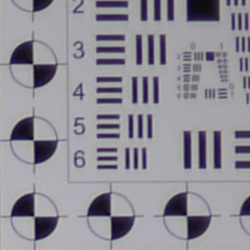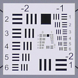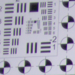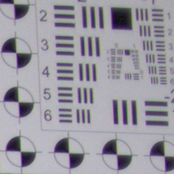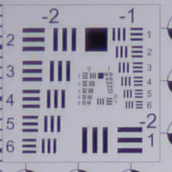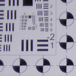 When shooting JPEGs, chromatic aberration in the corners with the Panasonic GF1's 20mm kit lens is quite low, with 2-4 pixels of fairly dull fringing. (This distortion is visible as a slight colored fringe around the objects at the edges of the field of view on the resolution target.)