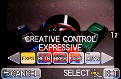 The earlier My Color mode is now known as Creative Control, and provides access to six effects, one more than in the G3 but two less than the GF2. Choices are Expressive (pop-art style), Retro (soft, tarnished effect), High Key (brighter image), Sepia, High Dynamic (localized color and contrast enhancement), and Miniature Effect (linear graduated blur towards the edges of the image).