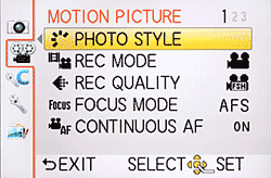 Of course, continuous autofocus is available during movies, complete with Touch AF. Other video recording features include a wind cut filter with four settings, and the mic's sensitivity can be adjusted to four levels. See the Motion Picture menu animation above right for additional features and settings.