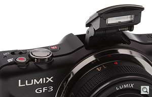 Flash. Like the GF2 before it, the Panasonic GF3 is said to be the smallest interchangeable-lens camera yet announced that includes a built-in flash strobe. The GF3's built-in popup flash has been relocated directly above the central axis of the lens, a position previously occupied by the hot shoe on the GF2, and this hints at an important omission. Unlike its predecessor, the Panasonic GF3 has no provision for external flash strobes. There's no hot shoe, and since the external accessory connector has also been removed, there's no possibility of a proprietary flash accessory being offered, either.