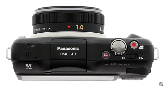 From left to right, the top features a monaural microphone, a speaker, a small pop-up flash, the Intelligent Auto button, Shutter button, Record button, and a sliding Power switch. The mono mic is a step down from the GF2 for video, and the lack of a hot shoe in addition to a pop-up flash is also a change from the last generation. At this size, Panasonic said they didn't see a lot of people adopting external flashes, so they were content to delete the hot shoe for lower weight and smaller size. That still leaves out the option of an optical or electronic accessory viewfinder, for whatever it's worth.