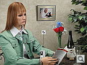 Paint mode provides a pencil, an eraser, and a stamp (with dozens of stamps) to paint over your image. You can change the size of the pencil or eraser, as well as the color of the paint (or should I say lead). This could be fun if you were waiting for a bus. (NB: The image distortion in the adjacent screen shot is from the video capture of the LCD screen.)