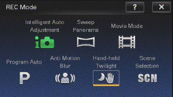 Modes. There are seven Record modes on the Sony TX1. Those include Intelligent Auto, Sweep Panorama, Movie Mode, Program Auto, Anti Motion Blur, Handheld Twilight, and Scene Selection.