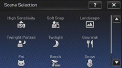Scene Selection offers High Sensitivity, Soft Snap, Landscape, Twilight Portrait, Twilight, Gourmet, Pet, Beach, Snow, Fireworks, Underwater, and Hi-Speed Shutter.