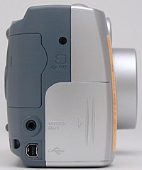 On the right side of the camera (as viewed from the rear) is the memory card compartment, battery compartment, Video Out jack, and USB jack. Both connector jacks are uncovered, making them easily accessible, but also exposing them to dust and other environmental hazards. The battery compartment door slides toward the front of the camera before opening on hinges, and the pressure of the door keeps the batteries locked securely in place. The SD / MMC memory card slot opens from the back panel, sliding outward before flipping open.