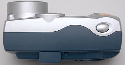 The DX3215's front panel divides its space between the lens, flash, optical viewfinder window, and light sensor. The lens barrel protrudes from the camera front a bit less than an inch, and the telescoping lens itself extends an additional quarter inch from the camera body when powered on. A small, plastic lens cap protects the lens surface when not in use, and tethers to the camera body via a small strap. The front hand grip consists of only a very slight bulge, but features a soft, rubbery pad to provide a better grip for your fingers.