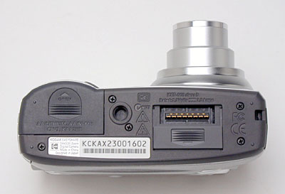On the bottom panel of the DX4330 are the tripod mount, dock jack, and battery compartment. The plastic, threaded tripod mount is off-center and too close to the battery compartment for quick battery changes while working with a tripod. (I doubt that this will be of much concern to most users though, as the DX4330 is clearly designed for on-the-go shooting.) I prefer metal tripod sockets, but the small size and low weight of the DX4330 mean the plastic socket should hold up fine. The battery compartment features a locking, hinged door, which slides forward to open. The dock connection jack is protected by a sliding plastic door, and connects the camera directly to the EasyShare dock for quick image downloading.