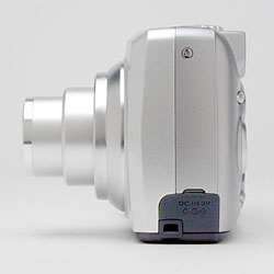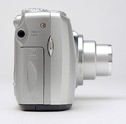 The telescoping lens takes up the right side of the camera's front panel, surrounded by a thick, plastic lip complete with filter threads for accessory lenses. The lens extends outward approximately another 7/8 inch when the camera is powered on. Also on the front panel are the optical viewfinder window, flash, self-timer lamp, light sensor, and tiny microphone. A gently-sculpted hand grip on the side of the camera features a soft, rubbery pad for fingers to cling to.