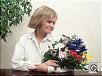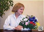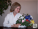 | Outdoor Portrait: Great resolution and detail, nearly perfect white balance, and excellent color. The extreme tonal range of this image makes it a tough shot for many digicams, which is precisely why I set it up this way, and why I shoot it with no fill flash or reflector to open the shadows. The object is to hold both highlight and shadow detail without producing a "flat" picture with muddy colors, and the DX6490 did a pretty good job. The shot at right was taken with a +0.3 EV exposure compensation adjustment, less than average for this shot. This left the midtones fairly dark, but left at least some detail in most of the highlights. (The strongest highlights are still blown out though.) I chose the Auto white balance as the most accurate overall, though it was almost identical to the Daylight setting. Overall color balance is about as close as you can get to being dead on, with Marti's white shirt almost perfectly neutral, and her skin tone appearing very natural. The blue flowers in the bouquet are a little darker than in real life, but color overall is really excellent. Resolution is high, with a lot of fine detail visible throughout the frame, although the camera's noise suppression algorithms flatten out detail in Marti's hair. The shadow areas also show good detail, with only moderate noise. Overall, a really excellent performance, although I'd like to see slightly lower contrast. To view the entire exposure series from zero to +1.3 EV, see files D64OUTAP0.HTM through D64OUTAP4.HTM on the thumbnail index page. | ||||||||||||||||||||||||||||||||
