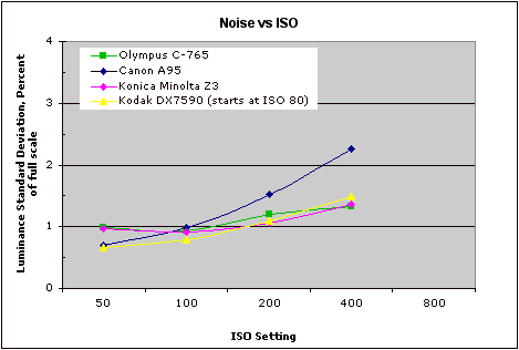 This chart compares the DX7590's noise performance over a range of ISOs against