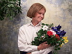 softness due to anti-noise processing. The extreme tonal range of this image makes it a tough shot for many digicams, which is precisely why I set it up this way, and why I shoot it with no fill flash or reflector to open the shadows. The object is to hold both highlight and shadow detail without producing a "flat" picture with muddy colors, and the DX7590 Zoom did a pretty good job with it. The shot at right was taken with a +0.3 EV exposure compensation adjustment, produced reasonable midtone values, but left the highlights a little blown-out looking. The shot with no exposure compensation held onto the highlights in Marti's shirt and on her face, but left the whole image a bit too dark-looking. I chose the Auto white balance setting for the main series, as the Daylight setting had a stronger red cast. Marti's skin tones are slightly reddish (as is overall color), and the blue flowers in the bouquet are darker and a bit more purple than in real life. (Many digicams have trouble with this blue, which is in reality a light navy with just hints of purple.) The bright yellows and greens look very good, but the red flowers are somewhat hot and oversaturated. Resolution is very high, with a lot of fine detail visible in the flower bouquet, and a fair amount in Marti's face, but the camera's anti-noise processing softens detail somewhat across the image. Shadow detail is moderate, and image noise there is low. To view the entire exposure series from -0.3 to +0.7 EV, see files 759OUTAM1.HTM