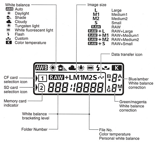 White balance color temperatures now entered directly via WB button and the main dial, vs in a menu window. JPEG, RAW, and RAW+JPEG formats all selectable via a single control. (No need for menu entry.) ISO speed extensions moved to main menu from Custom Function menu. Enlarge button added to control playback magnification. Erase button moved to bottom row with Quality and White Balance buttons. Erase button now has small raised point in center to distinguish from other buttons. Camera settings can now be saved to a memory card, allowing settings to be copied to multiple cameras used for covering a large event, or preserved when the camera is sent in for service. |