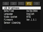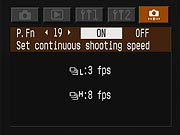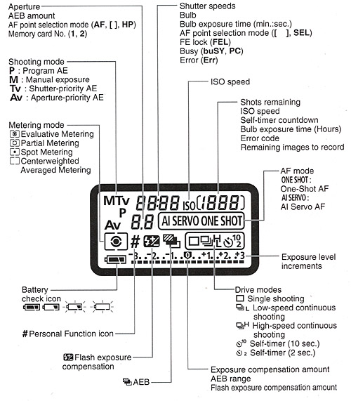 | Custom/Personal Functions | 21 custom functions. New or changed functions are: C. Fn-03, ISO expansion has been dropped. (ISO 50 ("L") and 3200 ("H") are always available) C. Fn-06, Exposure level increments, has been modified slightly, to give separate options for exposure settings and compensation adjustments. C.Fn-14 E-TTL II - was formerly "Auto reduction of daylight sync. C. Fn-21, Drive speed priority AI Servo, is newly added., Exposure level increments, has been changed to 0: 1/3 stop and 1: 1/2 stop. (Moved from Personal Function menu.) P.Fn-26 added, Shortened release time lag P.Fn-30 added, Quick Control switch turns off main dial too. P.Fn-31 added, Add original decision data. |