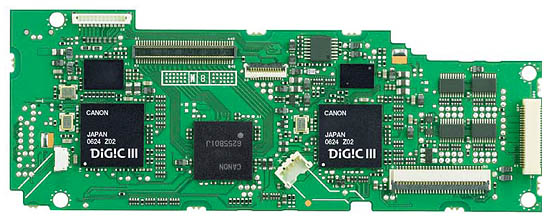- Dual Digic IIIs, with parallel processing. Canon's Digic III image-processor chip is arguably one of the fastest camera-based processing chips on the planet. Among other things, it's the key to Canon's fast performance and low power consumption in their high-end point & shoot models, and to their excellent noise-suppression processing (which takes a lot of computational horsepower). But even the zippy Digic III couldn't keep up with the absurd data rates generated by the 1D Mark III. So Canon took the simple expedient of doubling up on the processors, packing two Digic IIIs onto the Mark III's processor board. (Does that make it a Digic VI?)