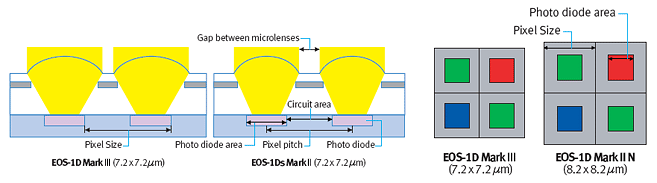 - Improved sensor layout, for higher "fill factor," and thereby better light sensitivity. Fill factor refers to the percentage of each pixel