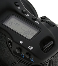 Status LCDs. The top Status LCD has changed less than the back Status LCD, which now accommodates a little more information for the greater number of image quality modes. The top deck's most welcome change is the four-stage battery icon, instead of the old two-stage icon on the 1D Mark II N. I've seen the big batteries in the old 1D cameras die quite suddenly, and with as much power as modes like Live View can use, you want to have a much better picture of your battery status than this.
