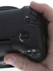 Once I get over the reverie that comes from picking up the 1D Mark III, I generally support it with my left hand, because it's heavy. It seems a little lighter than the Mark II N. My middle finger feels secure in the grip's top groove (though not as comfortable as it is on the 5D), and my index finger settles perfectly on the black shutter release. It might not be so perfect for everyone's hand, but this couldn't get better for me. My thumb supports the weight comfortably, and surprisingly does so without accidentally pressing the new AF-ON button. This new button is positioned in the same place you'll find it on the Nikon D200. It's just right. On the Mark II N, there's a button in the same place, though it's slightly smaller and a smidge higher; but was used in conjunction with the Command dial to switch between the last Registered AF point and the auto AF selection mode, or to adjust the White balance. I think it's better used as the AF-ON button.