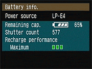 The LP-E4 is no longer a "dumb" battery, either. It has integrated electronics that can monitor charge cycles and adjust the battery gauge readout as the battery's capacity changes. Not only does the Status LCD report more charge levels, you can see the percentage remaining in the Battery info dialog, available in the Setup menu 2. This is a change that has been long overdue.