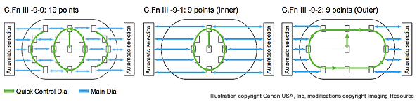 If you want to move to any of the 19 points in the viewfinder, you use the Main dial to move left or right, and you use the Quick Control dial to move in up or down in a vertical arc. On the outer ring, once you get to the top of either the left or right arc with the Quick Control dial, you have to move the main dial in the direction you want to go next. If you're at the top or bottom of the left arc, you turn the main dial to the right to move to the top or bottom center point, then turn it again to hop to the right arc. If you move beyond that, you enter Auto AF mode. Until you give up on the idea of an outer "racetrack," this default mode will befuddle you. I'd like to see an approach that includes the Multi-Controller, selectable via a Custom Function, because in my early shooting with the 1D Mark III, I've wanted faster AF point selection.