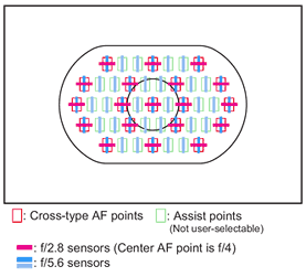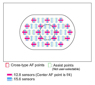 The central AF point strikes a compromise, working as a full cross-type sensor at f/4, and as a horizontal-only sensor down to f/8. Canon added one more interesting twist with the central array, though: While it doesn't cover as wide an area as the "f/2.8" arrays, it does have twice as many sensor elements per unit of length. This gives it accuracy equivalent to the f/2.8 arrays, but at a smaller aperture of f/4.