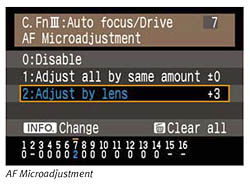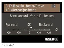 The second limitation is that there can only be a single correction factor for each lens, but some wide-ratio zoom lenses may actually need different focus adjustments at the wide and telephoto ends of their zoom range. In such cases, Canon recommends dialing in the focus adjustment based on the telephoto performance, since that's where the correction is likely to be the most needed.