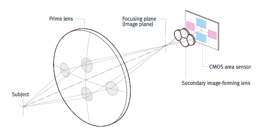 The Canon illustration above shows how a cluster of small secondary lenses diverts and directs light from the camera's lens onto each of the AF sensor arrays. (We colored the AF arrays to match the previous photo of the sensor itself and illustration of the AF points above.) The AF arrays are in pairs, the two to left and right combining to form the central cluster of vertical-line-sensitive AF points, and the large arrays top and bottom combining to form the array of horizontal-sensitive elements that cover the full AF area.