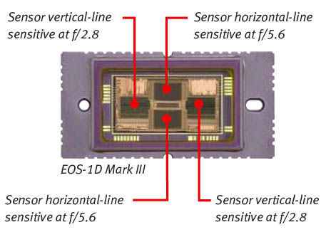 What this means for the EOS-1D Mark III is that its more closely spaced horizontal-sensitive AF arrays can work at apertures as small as f/5.6, while the more widely-separated (and therefore more accurate) vertical-sensitive arrays can only work at apertures of f/2.8 and larger.