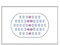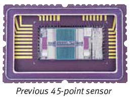 The photo above (also courtesy Canon USA, Inc.) shows the sensor from the new EOS-1D Mark III. Notice how all four sensor arrays are the same size, both vertical- and horizontal-sensitive elements now covering the full AF area. This is how the Mark III manages to distribute cross-type AF points across the entire AF area, rather than just in a cluster around the center. The two full-size AF arrays on the left and right contain elements corresponding to the pink-marked vertical-sensitive AF points in the diagram below.