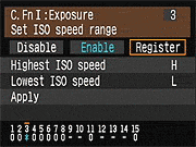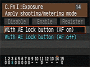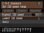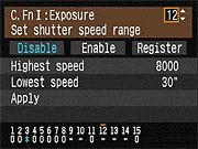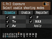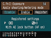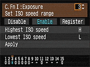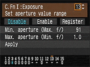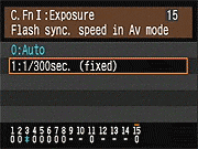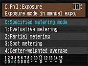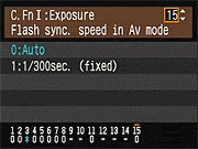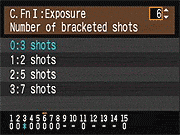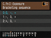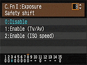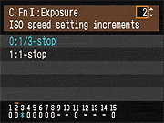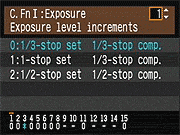 | Canon EOS-1D Mark III sports a very complete assortment of Custom Settings Menu options, which let you control a lot of the camera's inner workings. This is Custom Function Menu 1, which deals with Exposure options. |