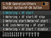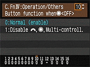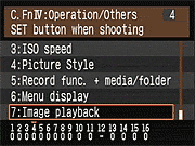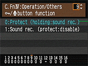 | Canon EOS-1D Mark III sports a very complete assortment of Custom Settings Menu options, which let you control a lot of the camera's inner workings. This is Custom Function Menu 4, which deals with operation and miscellaneous options. |