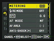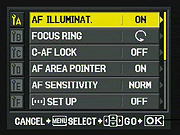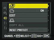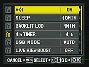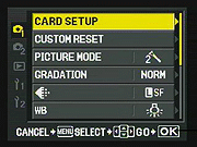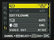 Pressing the Menu button provides access to the camera's full menu system. The Olympus E-3's menu system is pretty straightforward, with a tabbed interface and navigation via the 4-way arrow keys, the OK button, and the Menu button. The right-arrow takes you into the sub-menus for each setting option, OK confirms a selection, and the Menu button itself backs out of any given sub-menu screen without making a selection. This last isn't unusual, but we find it a little counterintuitive: If the right-arrow takes you down into a sub-menu, why doesn't the left-arrow take you back out?