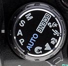 Mode Dial: Protruding up from the top panel, this dial controls the camera's main operating mode. Choices are Manual, Shutter Priority, Aperture Priority, Program, Auto, Portrait, Landscape, Macro, Sports, Night Scene, and Scene modes.