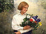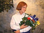 high contrast. The extreme tonal range of this image makes it a tough shot for many digicams, which is precisely why I set it up this way, and why I shoot it with no fill flash or reflector to open the shadows. The object is to hold both highlight and shadow detail without producing a "flat" picture with muddy colors, and the E500 handled the challenge fairly well, but lost a lot of highlight detail due to its high native contrast. The shot at right was taken with a +0.7 EV exposure compensation adjustment, actually a bit less than the average amount required for this shot. However, contrast is very high, with the camera losing most of the detail in the strong highlights of Marti's shirt, while at the same time, producing very dark shadows and midtones on Marti's face. Though overall color is a hint warm, I chose the Auto white balance setting for the main series. (The Daylight setting produced similar results.) Skin tones here are slightly orange from the warm cast, but are still in the range that I'd consider to be robust and healthy looking. The blue flowers in the bouquet also look pretty good, just slightly darker than in real life. (Many digicams have trouble with this blue, but the E500 does pretty well with it, getting the hue about right, just a bit darker than in reality.) The strong yellows, reds, and greens are also a little dark, but still look pretty good, although the reds in particular look too "hot." Resolution is very high, and a lot of fine detail is present in the flower bouquet, with good definition, although some detail is lost to anti-noise processing, in the subtly contrasting areas of Marti's hair. Shadow detail is pretty good as well, with low to moderate noise. To view the entire exposure series from zero to +1.3 EV, see files E5OUTAP0.HTM