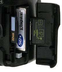 Storage and Power. The E-510 uses both CF cards (CompactFlash) and xD cards. This is great for those already invested in either kind of card. Most pro SLRs use CF, so E-1 owners will already have storage for these new cameras; but consumers who own a digicam that uses xD can also step into the E-510 with less initial cost.