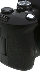 Grip. Unlike it's little brother, the Olympus E-510 has a nice big grip. Your middle finger has a smooth contour to help position it, and there's sufficient room for all fingers on most hands. A good size ridge on the back gives your thumb a place to hold, and both surfaces have a soft, textured, rubbery pad to improve traction. This is the kind of grip you need for a day of shooting, especially with Olympus's big 50-200mm f/2.8 zoom lens. I wouldn't mind a little more of a lip under the shutter button, though, because it feels a little insecure when picking up the camera at first.