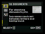 Documents: Best for shooting black and white documents, this mode increases contrast for better viewing. - Panorama: Here, the camera lets you capture a series of images to be stitched together into one panoramic image. As with many Olympus cameras, this function is only available with an Olympus brand xD-Picture Card in use.