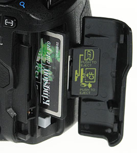 Media Door and Storage. The Olympus E-520's frame has a hinged door near the back of the right handgrip that houses both xD and CompactFlash media slots. The dual memory configuration can be customized to shoot RAW+JPEG to different media, transfer images back and forth between them, or combine both to maximize capture. Most of the Olympus E-520's direct competitors only offer a single storage slot.