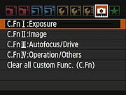 -C.Fn.I-2 ISO Speed Setting Increments -C.Fn.I-3 ISO Expansion -C.Fn. I-4 Bracketing Auto Cancel -C.Fn. I-5 Bracketing Sequence -C.Fn. I-6 Safety Shift -C.Fn. I-7 Flash Sync. Speed in Av Mode |