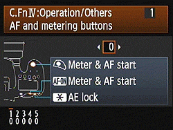 By default, the AF-ON button allows you to set focus before depressing the shutter button. On pressing the AF-On button, the 60D's metering system will come to life, and autofocus will begin. If you release the AF-On button, then the camera will release the metering lock, and will refocus if you subsequently press the Shutter button. If you keep the AF-On button depressed, though, then the Shutter button will simply initiate the exposure, with focus and metering remaining as set when the AF-On button was pressed. This default behavior can be changed in a variety of ways, as described momentarily.