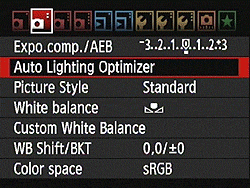 First seen on the Rebel XSi, Canon's Auto Lighting Optimizer (ALO) function lets you expose for the highlights, preserving detail there, while the camera adjusts the image to open up the shadows. This happens on the fly, as the files are being written to the memory card, so there's no post-capture intervention by the user required to take advantage of this function. We weren't terribly impressed with ALO on the XSi, however newer Canon models including the 60D offer four different settings for it, and the control on the 60D seems quite effective. The ALO setting is made via Record Menu 2, where you can select options of Disable, Low, Standard (the default), or Strong.