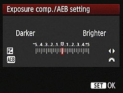An automatic exposure bracketing feature lets you set the Canon 60D's total exposure variation (across three shots) at anywhere from +/- one-third or one-half EV, up to +/- 3 EV, a rather wider range than was available in the 50D. Exposure bracketing and exposure compensation are additive, in other words the automatic variation is centered around whatever level of manual exposure compensation you have dialed in. Thus, you could manually set a positive exposure compensation of 1 EV, and then have the camera give you a variation of +/- 2/3 EV around that point. (This also means that the bracketed exposures can go outside of the standard exposure compensation range, allowing one shot as far as 8 EV from the metered exposure.) The number of shots in a sequence is fixed to three, and the sequence order can be changed to either 0, -, + (metered, under, over), or -, 0, + (under, metered, over).