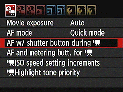 The AF-ON button also controls autofocus operations in Live View and Movie shooting. The Canon 60D now has two styles of autofocus operation in Live View mode: the standard phase detection method, which requires the reflex mirror to be briefly swung back into the optical path, thus disrupting the live view briefly, or a contrast detection method which does not. Both methods have their advantages and disadvantages, but the contrast-detect method offers an uninterrupted user experience. A third method incorporates a face detection into the contrast detection method, offering the face-detecting mode of autofocus now commonly seen on consumer point-and-shoot cameras. The same three choices are available in Movie shooting, although phase detection isn't available during movie capture. If set to use phase detection AF before recording, the 60D will seamlessly switch to using contrast detection after the recording is started.
