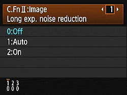 The Canon 60D offers two types of adjustable noise reduction. Long Exposure noise reduction can be performed for exposures one second or longer, and works by taking a second "dark frame" of equal duration with the shutter closed, and then subtracting it from the first frame. This reduces or eliminates most noise generated by the sensor during long exposures at low ISOs, but can make noise worse at higher ISOs (at ISO 1,600 and above). Available settings are Off, Auto and On, and are accessed from Custom Function II-1. The Off setting is the default. The 60D also offers the user four levels of high ISO sensitivity noise reduction. Options are Standard, Low, Strong, and Disable, with Standard being the default. Though the name implies this noise reduction is only applied at high ISOs, the Canon 60D applies it to all ISOs. This explains why the 60D's chroma noise in shadows and darker tones is lower than most DSLRs at low ISOs, when using the default Standard setting. These settings are accessed in Custom Function II-2. High ISO noise reduction is not applied to RAW files.