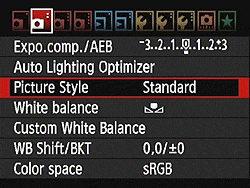 As with other recent Canon DSLRs, the Canon 60D offers a Picture Style option through the LCD menu, which lets you select from Standard, Portrait, Landscape, Neutral, Faithful, Monochrome, or three User Defined settings. In each of the preset modes, the Contrast, Saturation, Sharpness, and Color Tone are set for specific conditions. For Monochrome, Saturation is replaced with Filter effect (options are: None, Yellow, Orange, Red or Green), and Color Tone is replaced with Toning Effect (None, Sepia, Blue, Purple or Green). The three User Defined options let you manually adjust each variable, then save it as a custom parameter. Of course, you can also set the camera's color space to sRGB or Adobe RGB.