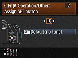 Through Custom Function IV-1, the behavior of the Shutter, AF-On, and AE Lock buttons can be changed. By default, autofocus and metering are initiated with a half-press of the shutter button or the AF-On button, while a single press of the AE Lock button locks exposure until the 60D's metering system powers down. There are no less than eight alternatives to this behavior. The first unbundles focus functions from the shutter button, so that the AF-On button must be used to lock focus. The second option does the same, but switches the functions of the AF-On and AE Lock buttons. A third option locks exposure with either the AE Lock button or a shutter button half-press, while AF and metering are handled by the AF-On button. Option four again reverses the functionality of the AF-On and AE Lock buttons from the third option. The fifth options replicates the second one, but also triggers autofocus with a half press of the shutter button. Option six uses the shutter button to start metering and autofocus, the AF-On button to cease autofocus operation, and the AE Lock button as its name would suggest. The next option again reverses the behavior of the AF-On and AE Lock buttons. Option eight is similar to number six, but disables the AF-On button altogether. Finally, option nine instead disables the AE Lock button, and uses the AF-On button for this function instead. Custom Function IV-2 allows functions to be assigned to the Set button, located in the center of the Multi-controller. By default, this button serves no purpose in Record mode. If desired, however, it can provide quick access to image quality, picture style, white balance, flash exposure compensation, or viewfinder electronic level functions. When set to this last, information from the single-axis roll level is used to provide a level display using the exposure level scale in the viewfinder. Finally, Custom Function IV-3 allows the direction of the Main and Quick Control dials to be reversed when adjusting the Aperture or Shutter values in Priority, Manual, or Bulb-mode shooting. Rather counterintuitively, this option is ignored when in movie mode, and doesn't affect dial rotation for exposure compensation, nor for Program Shift. In Movie mode, there is similar functionality to Custom Function IV-1, but it is set through an option in the Movie menu, since the Custom Function menu can't be accessed in Movie mode. The option set here is separate from that for still image shooting, allowing different control mappings in each mode. A separate option allows autofocus with the shutter button to be enabled or disabled in Movie mode.